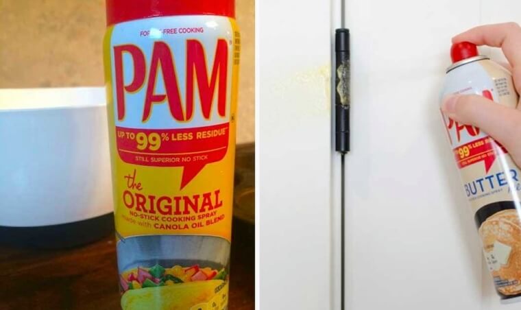 All you need is some cooking spray, which you probably have at home. Just take the can and spray it on the hinges of the squeaky objects. The noise will disappear in seconds, and you can use everything without this issue.