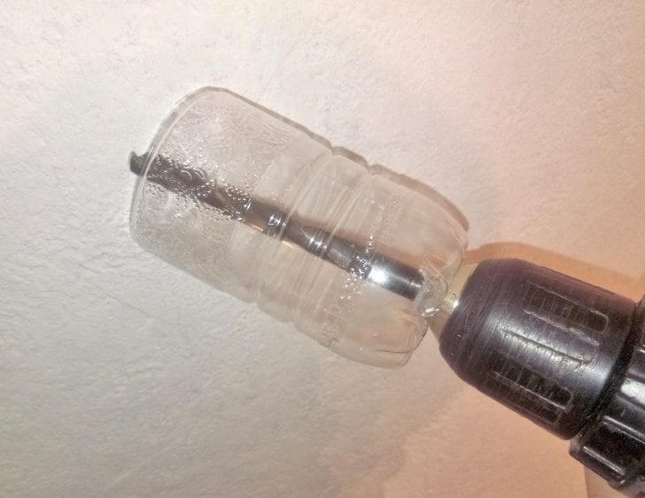 Simply take a plastic bottle, cut off the top, and attach it to the drill. By doing this, any debris that falls while drilling will collect in the plastic bottle, saving you hours of cleanup later.