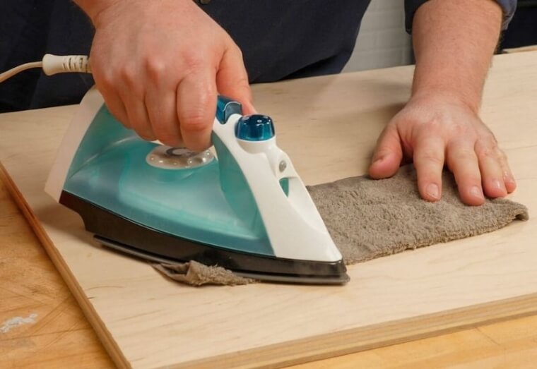 Begin by taking a washcloth, soaking it, and wringing out the excess water to ensure it is just damp. Next, lay the washcloth over the dent. The water will seep into the wood, so don’t be surprised; this is completely normal. Make sure your iron is ready and set to the highest heat setting before putting the damp washcloth in place. Use small circular movements with your iron on the washcloth, and then press it down until the moisture has fully evaporated. Repeat the process until the dent in the wood has expanded back to its original position.