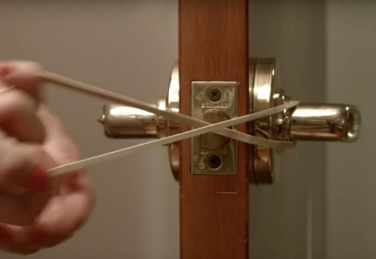 For this to succeed, you’ll need a thick rubber band rather than the standard thin ones. Start by keeping the door open and wrapping the rubber band around the door handle on one side. Then, stretch the rubber band to the handle on the opposite side and apply the same wrapping method. When the rubber band is stretched from one side to the other, make sure it runs both over and under the door’s latch. This creates a cushioning effect, stopping the door from closing. If you don’t have thick rubber bands, you can use several rubber bands to achieve the same effect.