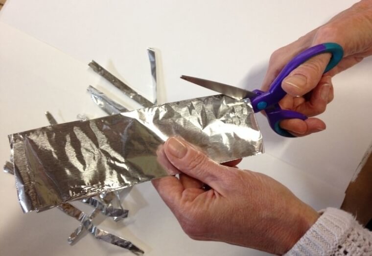 Begin by taking a piece of aluminum foil that is 8 to 10 inches long and fold it lengthwise. Then, use scissors to cut the folded aluminum foil lengthwise as well. Cut the foil into thin strips so that you can make multiple cuts with the same piece of foil. If needed, you can use another piece of folded aluminum foil. Ensure that every part of the scissor blades comes into contact with the foil by using full strokes. After finishing this step, dampen a paper towel with warm water and use it to wipe the scissors to remove any residue.
