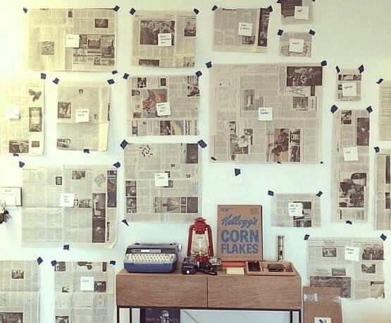 Using a newspaper, you can effortlessly organize the layout of your gallery wall and develop a template to ensure your plan meets your satisfaction. Begin by positioning a frame over the newspaper and tracing its outline with a black marker. Remove the frame, cut out the shape you traced, and label it with a number assigned to that specific frame. After completing this step for each frame, use painter’s tape to affix the newspaper cutouts onto the wall. The painter’s tape allows you to remove the newspaper without harming the paint on the wall.